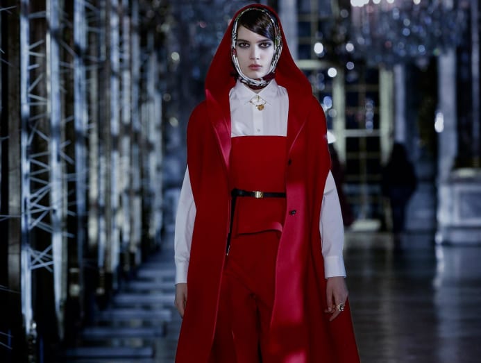Titled Disturbing Beauty, Dior’s show was a fairytale-inspired theatrical spectacle, filmed in the Hall of Mirrors at Versailles. In particular, Little Red Riding Hood was given an edgy makeover, as Maria Grazia Chiuri filled the runway with hooded capes, black leather dresses and princess-style tulle gowns.