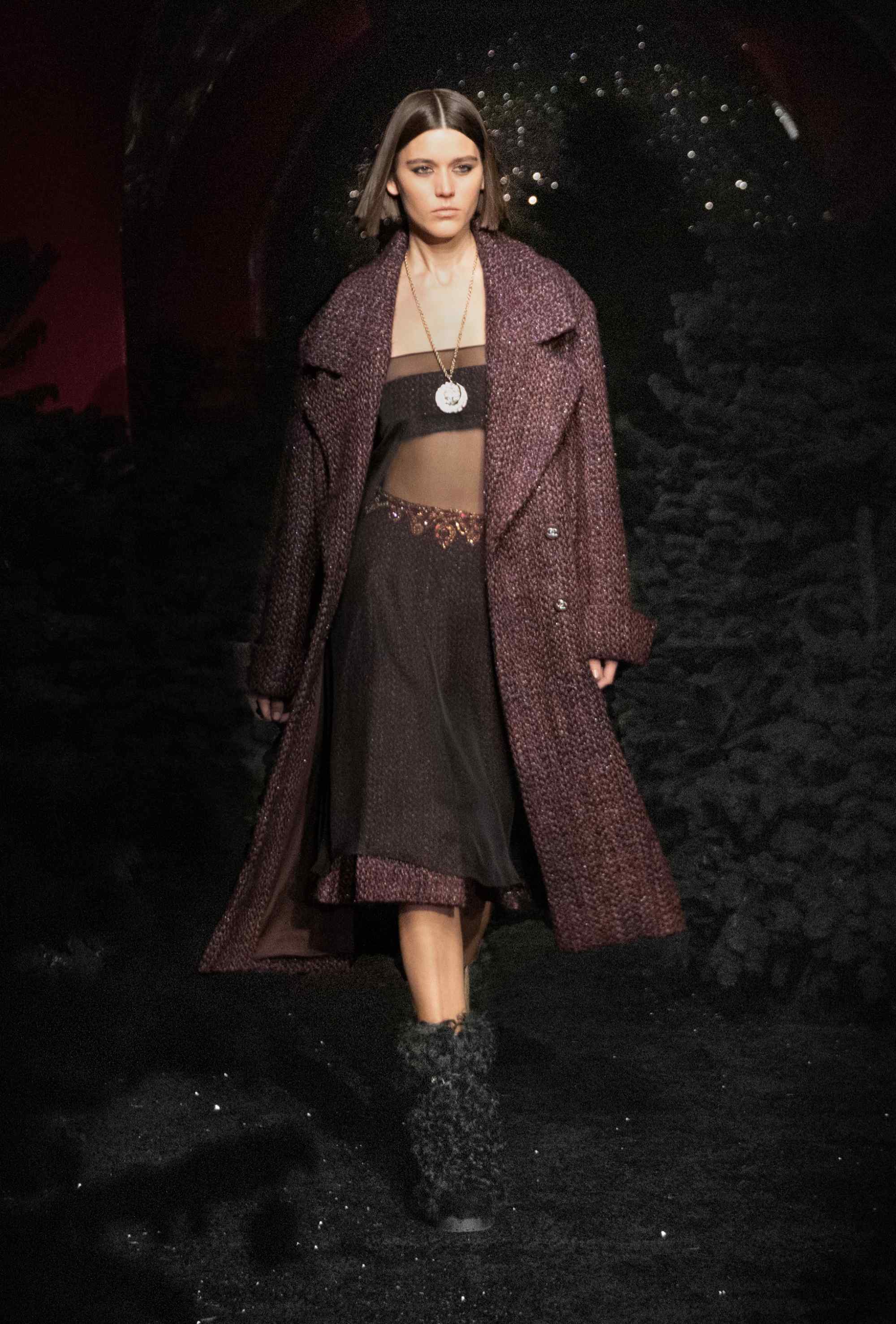 Over at Chanel, it was a succession of tweed coats for a ski-themed collection. Virginie Viard took her Chanel girls to the streets of Paris, before bringing them on a night out at Castel, a club favoured by the fashion crowd. Here, models took off their coats, revealing sheer dresses, delicate blouses and slinky bandeau tops.
