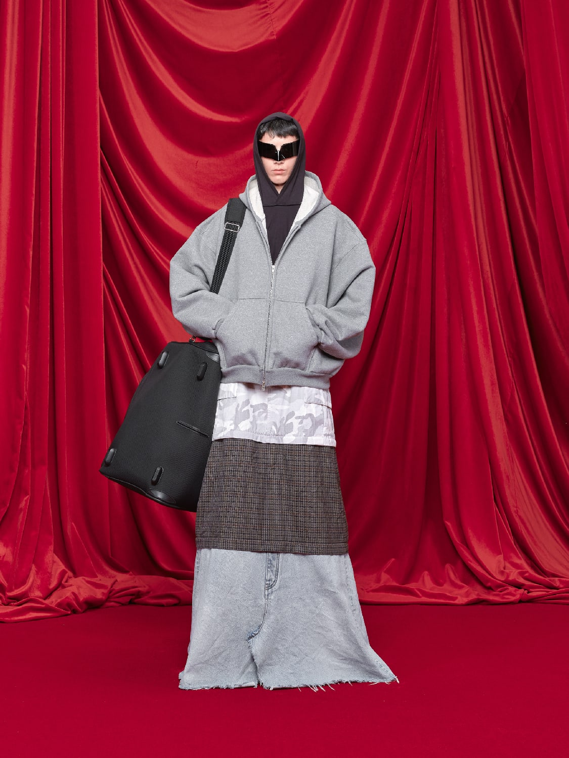 The show opened with Demna’s mother in a many-sleeved black raincoat and was bookended with Demna’s boyfriend in a traditional lace wedding dress – veil included. In between, other zany persons wore the usual oversized outerwear and trousers, boulder-sized shoulders, delivery worker gear, shrunken hoodies and bath robes, wobbling along on cartoon-big trainers.
