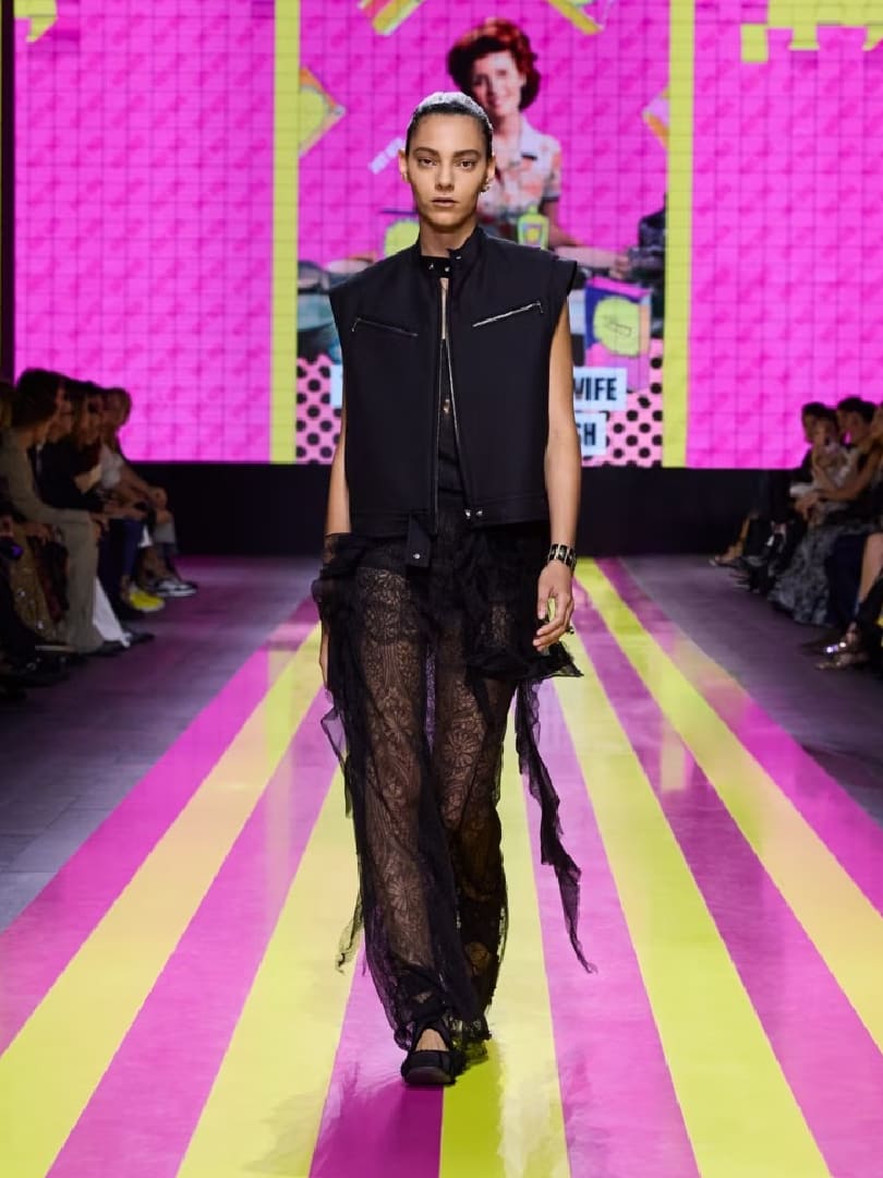 Female empowerment was also seen as a grey denim jacket with burn-mark trim (witches were burnt at stakes?), and a plethora of black net dresses showing off prim bras and panties. The latter item is a Grazia Chiuri signature.