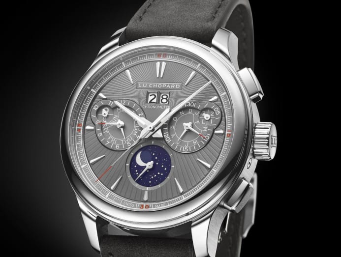 It’s still the manual winding L.U.C 03.10-L in-house movement that powers it, giving the watch a date window at 12 o’clock, a moon phase at 6 o’clock and a flyback chronograph.