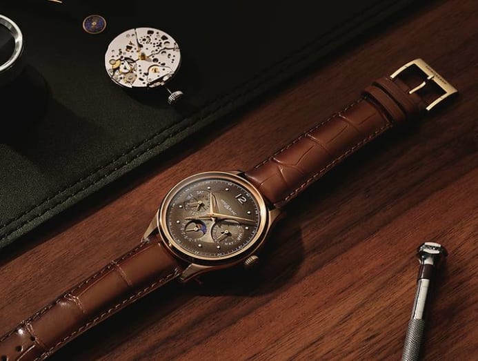 Inside the 40mm case is a domed and lacquered face decorated with three types of finishes: A sunray-brushed middle, snailed sub-dials, and a grained outer ring. The sfumato (smoky) brown dial is echoed by a brown alligator strap tanned to the same effect. Limited to 100 pieces.