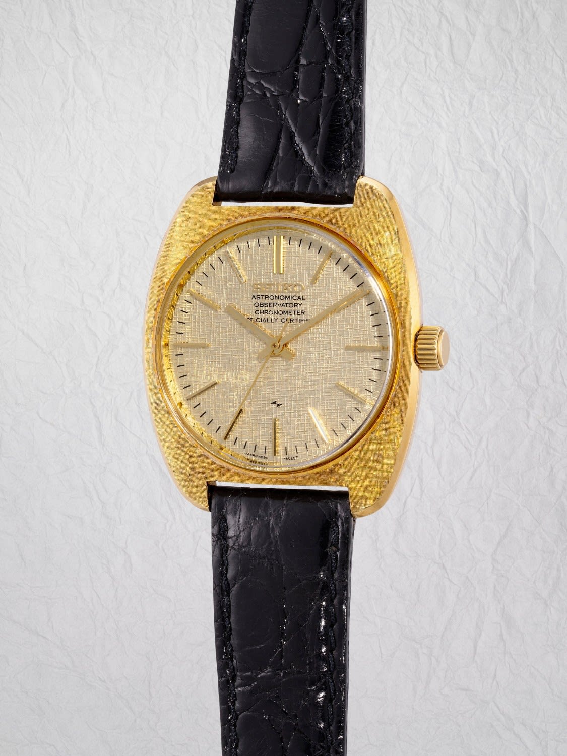 Following that achievement, Seiko started developing highly accurate wristwatches called the Astronomical Chronometer, with 226 of them certified by the observatory. By the late 1960s, these watches cost six times more than the basic Grand Seiko at the time. What makes this auction piece exceptionally rare is its exhibition case back, as most had solid ones.