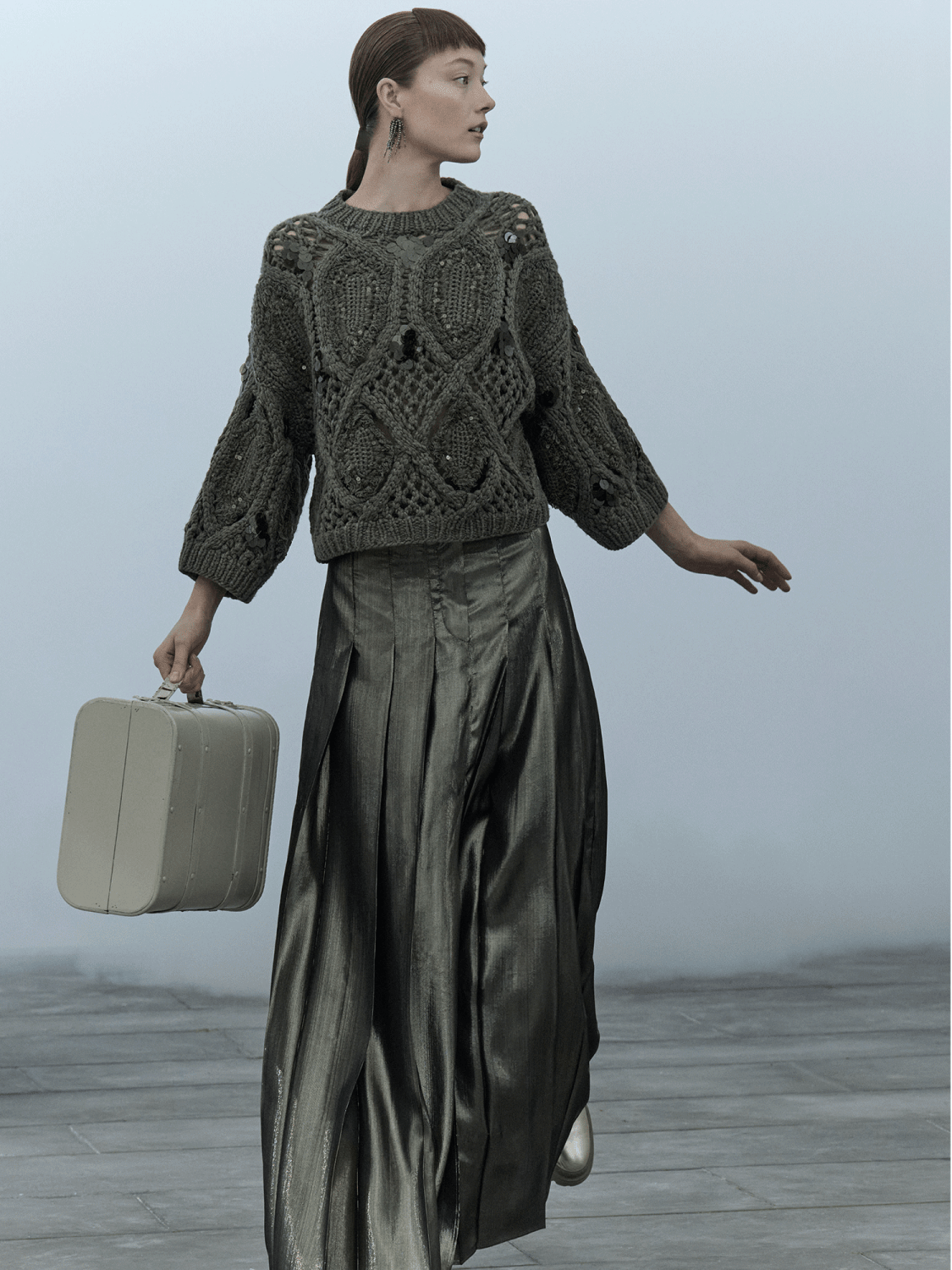 Knitwear – the beating heart of Brunello Cucinelli's fall/winter 2022 collection for both men and women – can be found in multiple categories including jackets, travel wear, coats, skirts, trousers and footwear. Consider these pieces the basic building blocks of your occasion wear wardrobe as they offer a distinct yet relaxed appearance, plus a touch of luxe to your outfit.