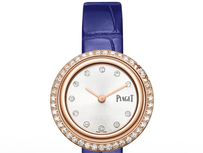 There are multiple variations to this fun little feature in Piaget’s Possession line, but the one pictured here is the Ref. G0A44282 which has an 18K rose gold case set with 42 brilliant-cut diamonds, paired with an interchangeable blue alligator strap.
