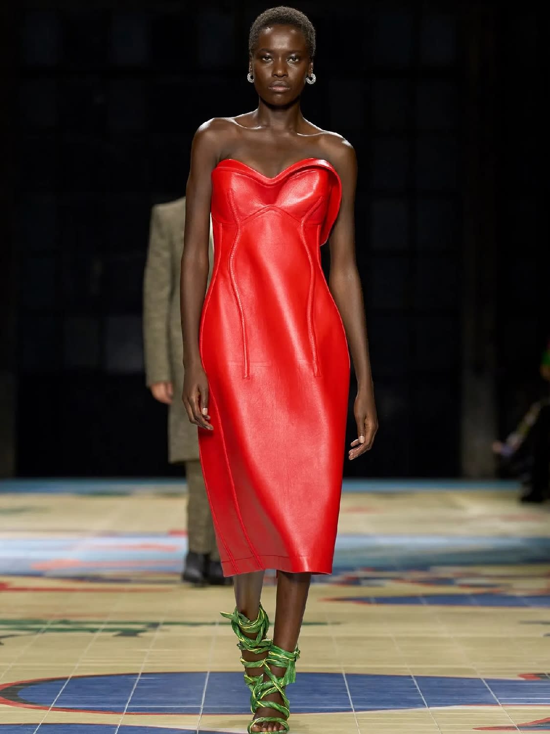 Then there were the tweeds that became sculptural dresses, suits and coats. Of course, there was leatherworking techniques, this being a leather house: Strips of leather got pieced together into sensuous cowled tunics; leather “banana leaf” sandals; papoose bags and the wide trousers, oversized blousons and fishing baskets – everything in leather.
