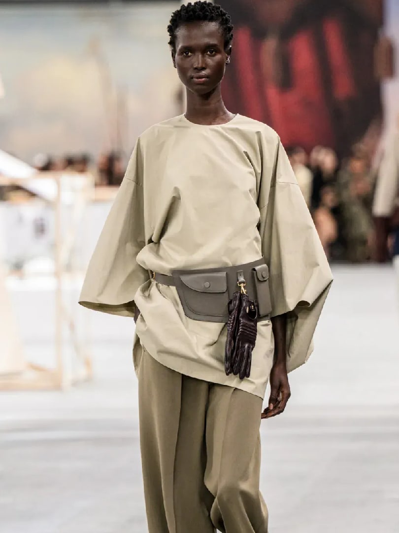 Walter Chiapponi, in his farewell collection for Tod’s, showcased one of his strongest offerings to the heritage leather label. There was ample menswear tailoring, cut from beautiful light fabrics and fine leather in earth tones, with pleating and draping to create a voluminous silhouette made for eternal coats, pants and skirts. It was also a regal medium to highlight Tod’s Di Bag, ballerina flats (like hoofs of chartreuse, taupe and black), and tool belts, which has multi-use practicality and fetish charm. Outstanding were a couple of overblown tunic tops, one in khaki and one in baby blue.