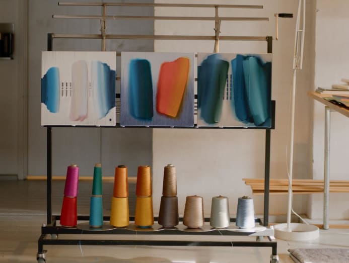 Five years ago, Mann started painting again, her former tutor’s words no longer holding her back. “Weaving is very slow and very technical. I wanted to make work that was quicker, more intuitive and spontaneous,” she shared. Soon, she became obsessed. She would paint all day, producing hundreds of paintings. In 2021, she started painting on top of her woven works, creating what she calls “thread paintings”, characterised by sweeping, abstract expressionist gestures.