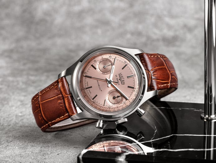 Look two decades forward, and there you’ll find Vulcain’s Chronographe 1970's, the latest revival model from its 165-year archives. The 38mm manual-wind watch comes in four colour options: A blue dial with grey counters in true homage to its inspiration, a silver dial with black counters, a black dial with silver counters and a monotone salmon dial that the brand reserves for its limited editions (in this case, it’s 50 pieces). Snailed counters accompany the sunray-finished dial within a 12.40mm thick step-case that remains identical to the original chronograph.