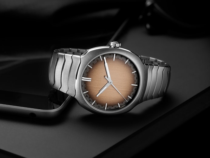 H. Moser & Cie is known for presenting impeccable watches with a hefty dose of humour, and its latest Streamliner Centre Seconds Smoked Salmon timepiece’s name says it all. The three-hand watch features a salmon fume dial (darkened or smoked around the edges) within a 40mm cushion-shaped steel case with a fully integrated bracelet. It’s a vision of sporty modern-retro stylistics, completed with hands featuring Globolight (a ceramic-based material that contains Super-LumiNova) inserts. As for the unique shade featured on the HMC 200 automatic calibre watch, brand CEO Edouard Meylan quips that the inspiration comes from Coho salmon, and not the “traditional Atlantic salmon” so regularly featured—on plates as well as timepieces.