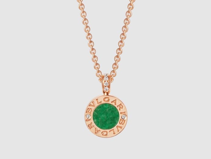 Bulgari’s iconic Bvlgari Bvlgari collection is a classic symbol of the Italian jewellery house. The trademark double logo draws inspiration from ancient coins, and this necklace, set on an 18K rose gold chain, features a pendant set with green jade and pave diamonds.