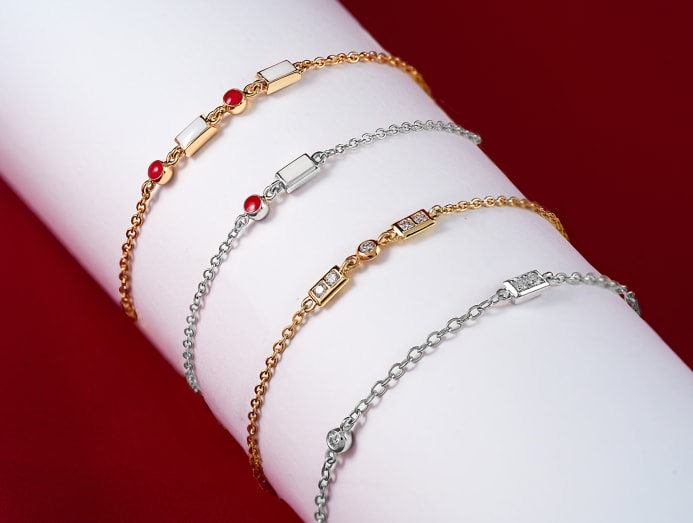 The collection also includes a limited edition of 60 customisable CODE Link bracelets in 14k gold with natural diamonds. Each bracelet features a unique dual-sided design: One side displays the wearer's customised initial in morse code diamond dots and dashes, while the reverse showcases the red dot and white dash in enamel.