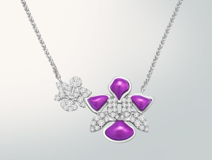 The orchid motif of the pieces draw inspiration from the Vanda Miss Joaquim, Singapore’s national flower. The petals of the pieces are rendered in PurpleGold, created from 19k solid gold. This is contrasted with white gold and accented with diamonds. There are two versions – a single motif pendant and a double motif necklace.