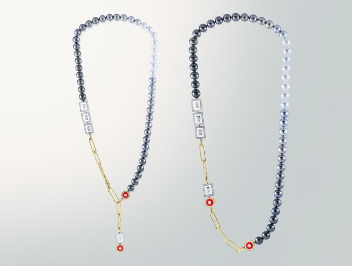 The highlight of the collection is a modular CODE Pearl necklace that spells out “One” (meant to symbolise unity) in morse code, featuring diamond dots set in red enamel and diamond dashes set in white enamel.