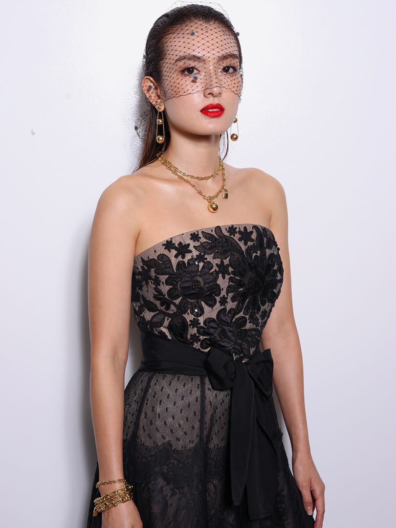 Hong Ling brought an edgy touch to her lacey ensemble with jewellery from Tiffany & Co’s Hardwear collection.