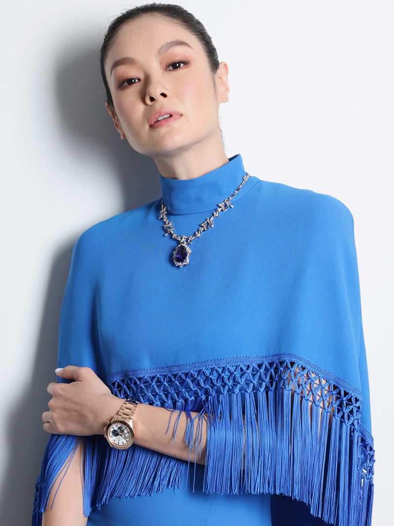 New mum Sheila Sim wore a caped gown to the awards, with a Zenith Chronomaster Sport timepiece on her wrist. She topped off the look with a 40.66 carat Tanzanite and diamonds encrusted necklace from local jeweller, Madly Gems, owned by former radio DJ Maddy Barber.