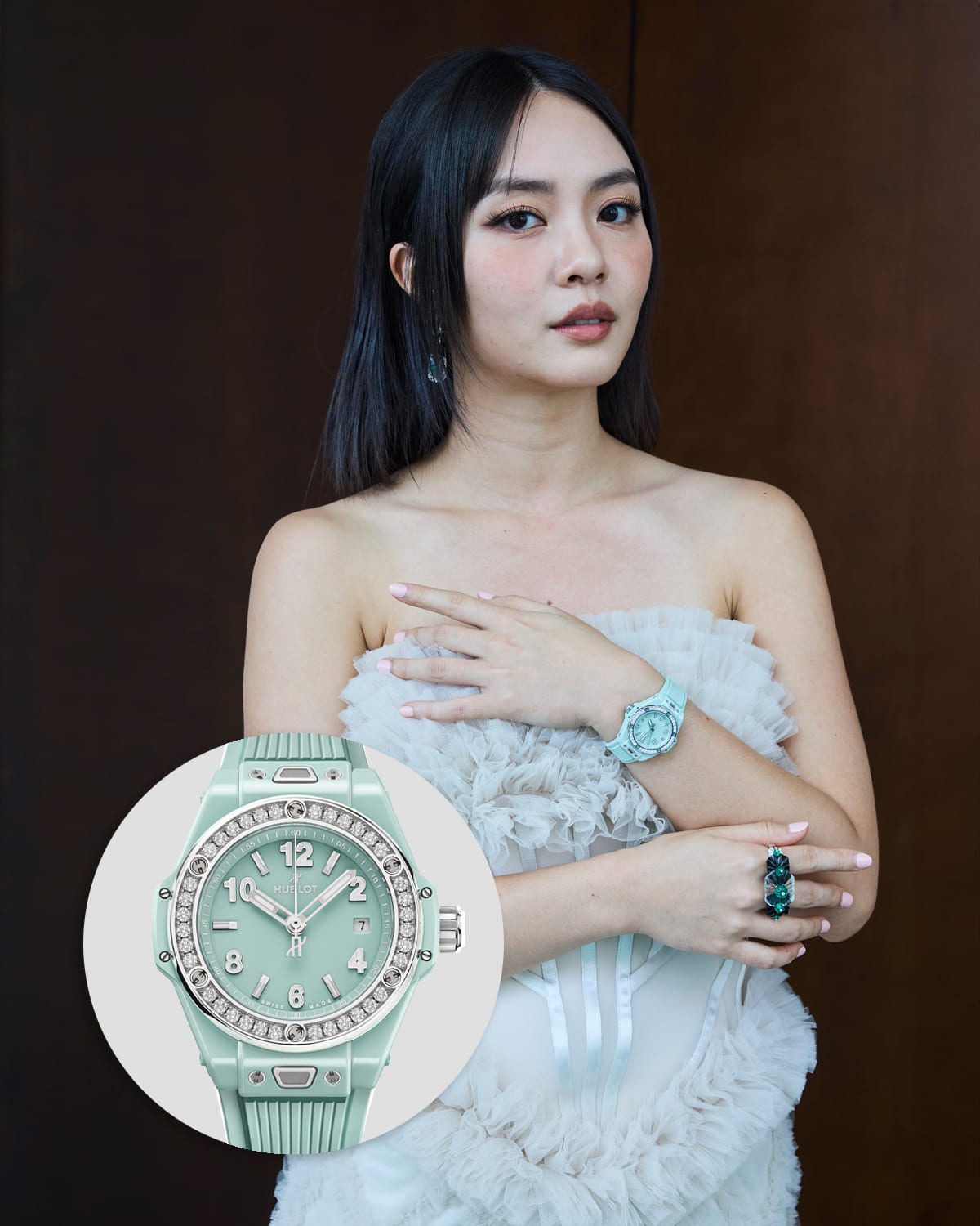 Ng had a big role to play as host of the night, and the actress hit the red carpet wearing the Hublot Big Bang One Click in a delicate shade of mint green, adding a pop of colour to her cream gown.