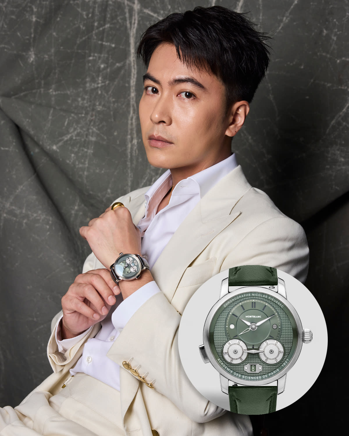 Xu Bin’s Montblanc Star Legacy Nicolas Rieussec Chronograph paired nicely with his cream ensemble.