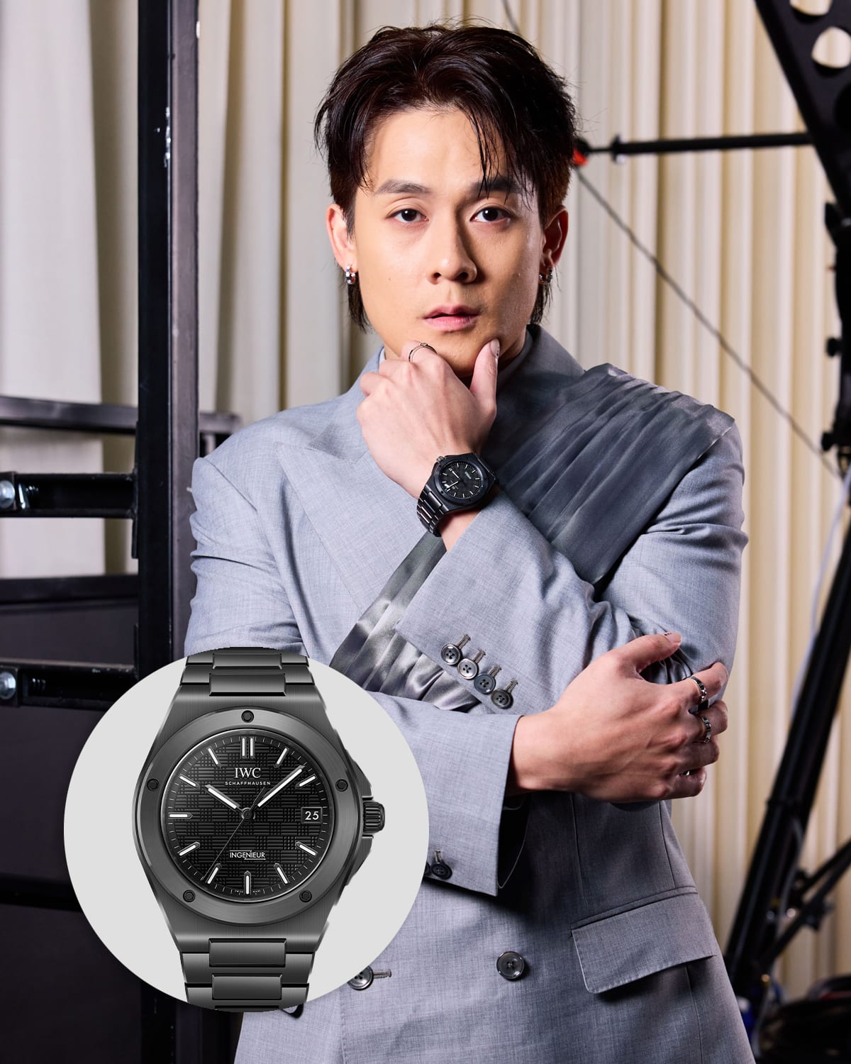 Decked out in a grey ensemble, Richie Koh kept things modern with the IWC Ingenieur Automatic 42 in black.