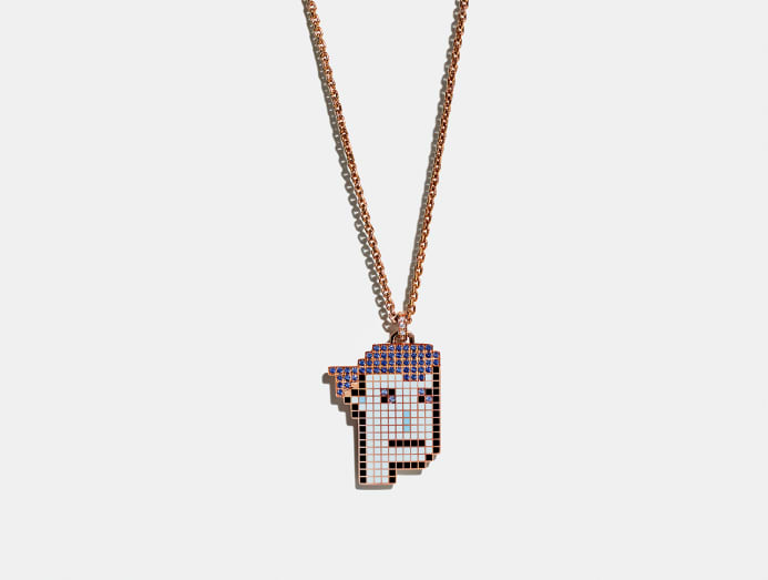 Each pendant will be comprised of at least 30 gemstones and/or diamonds to create a custom design with the highest fidelity to the original NFT. It will be made of either 18k rose or yellow gold, worn on an adjustable chain measuring between 18-22 inches, composed of rectangular links that draw inspiration from the shape of square pixels.