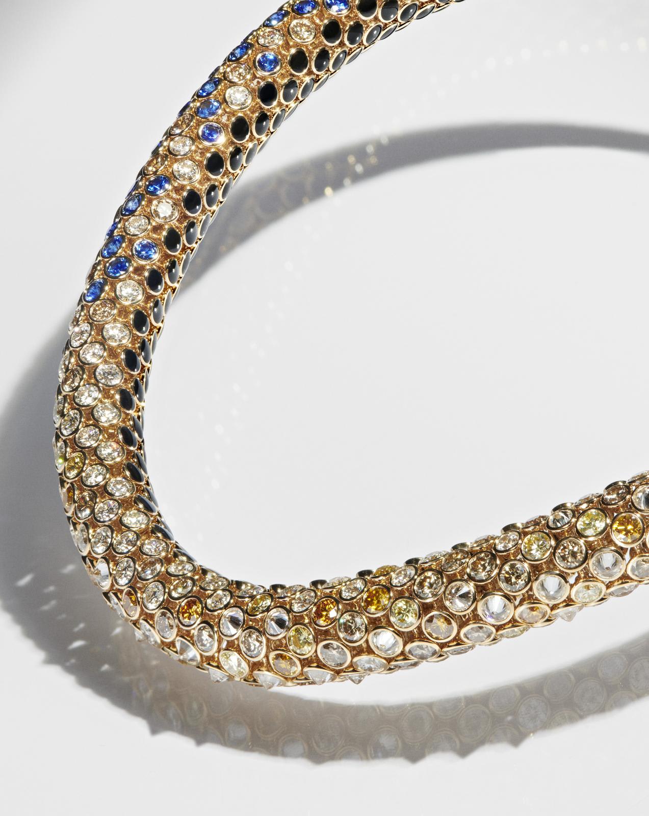 “This work of art explores the complexity of nature and vitality, transporting us to a place where contrast and extremes reign. The precious stones are in vibrant, opposing colors: glowing yellows and fiery oranges diamonds evoke a relentless desert sun, while cool blues sapphires pierce the landscape like oases, and deep blacks onyx hint at the depth of the desert’s secrets. This universe is mysterious, spontaneous – and ultimately balanced,” shared Marie-Laure Cerede.