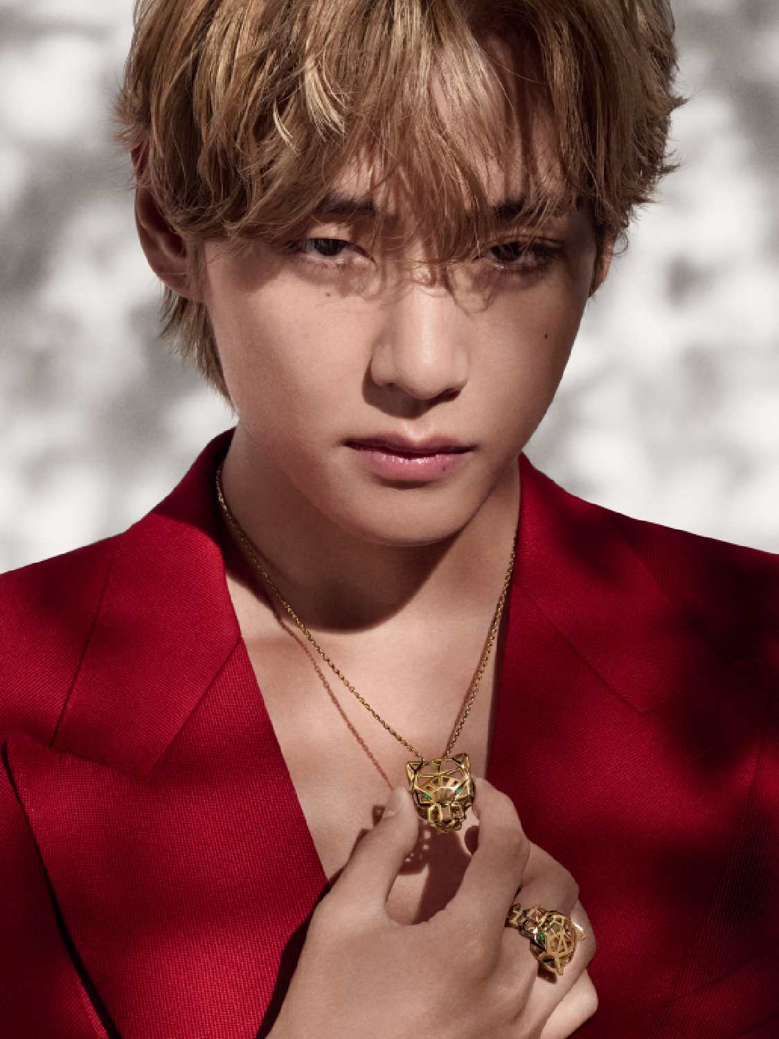 In the campaign, V is seen wearing a sculptural panther ring and a panther necklace.
