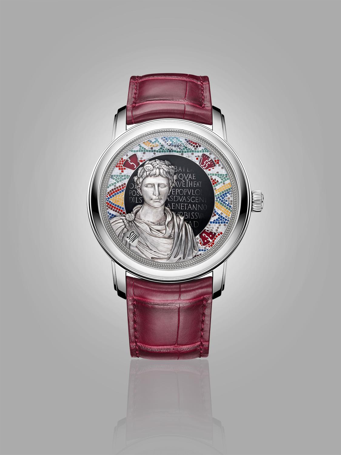 The ancient Romans were known for their mosaic tilework, so on the Roman edition, artisans used stone micro-mosaic techniques to frame the white gold bust of Augustus with the accompanying Latin script engraving. Meticulous care was needed to put each of the 660 hard stone fragments in place; any error would require the dial to be painstakingly re-enamelled.