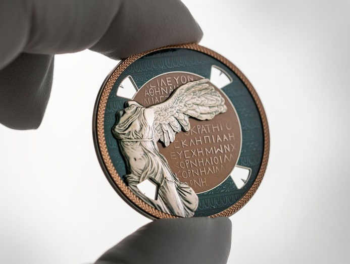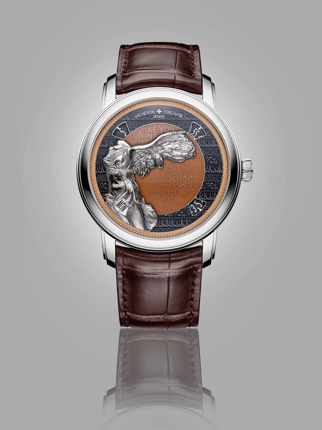 On the Greek model, the Victory statue (also in patinated white gold) is positioned off-centre, to emphasise the dramatic form of her wings. Here, enamelling techniques were used to generate the brown colour on the dial centre – a hue reminiscent of ancient Greek vases. Note the ancient Greek script engraved on the sapphire crystal.