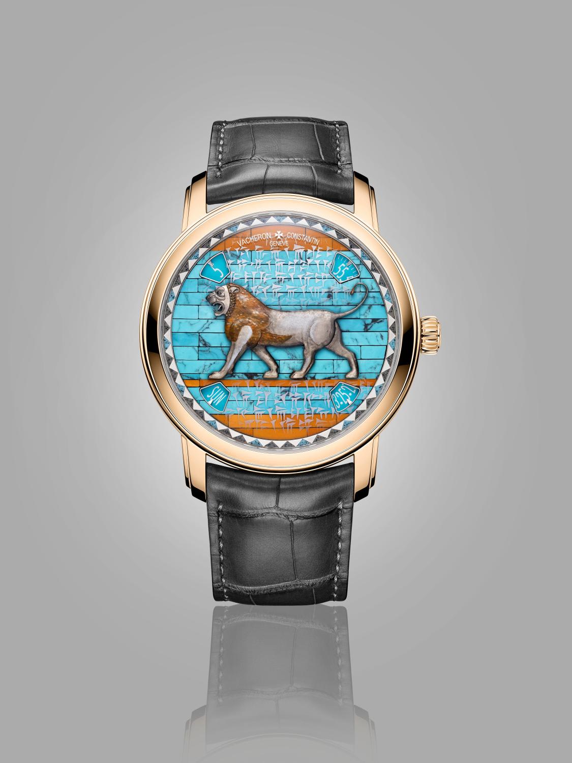 On the Persian edition, the patinated white gold lion applique appears against a background of stone marquetry and cuneiform writing. The turquoise and yellow mochaite jasper stones give the dial a very realistic look. It’s as if the frieze wall on which the original lion was carved had been miniaturised to fit the 42mm watch.
