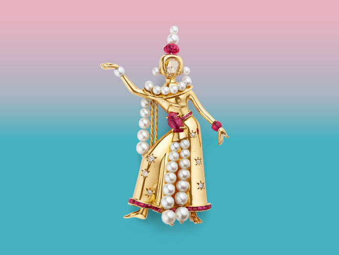 Throughout its history, Van Cleef & Arpels has also drawn inspiration from the world of dance. Another unique creation on display is the Balinese Dancer Clip from 1969, crafted from yellow and white gold. The dancer is brought to life wearing accessories shaped with cultured pearls and rubies, and a sculpted dress interspersed with star-set diamonds.