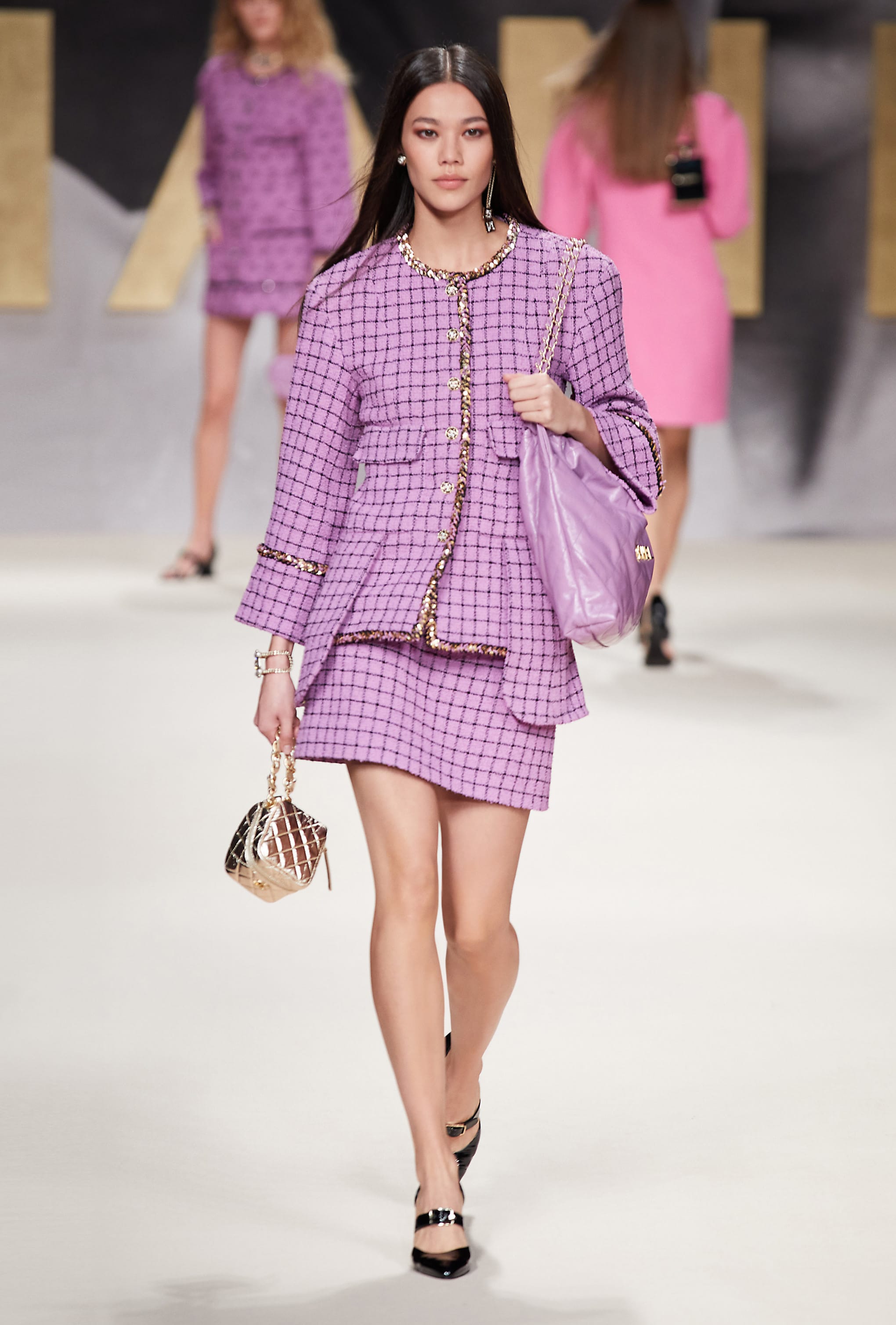 It was back to the 1980s for Chanel, who held an upbeat runway show with models smiling and laughing. Beachwear, from bikinis to one-pieces, opened the show, followed by sequined short dresses, leather dungarees and candy coloured tweed co-ords.