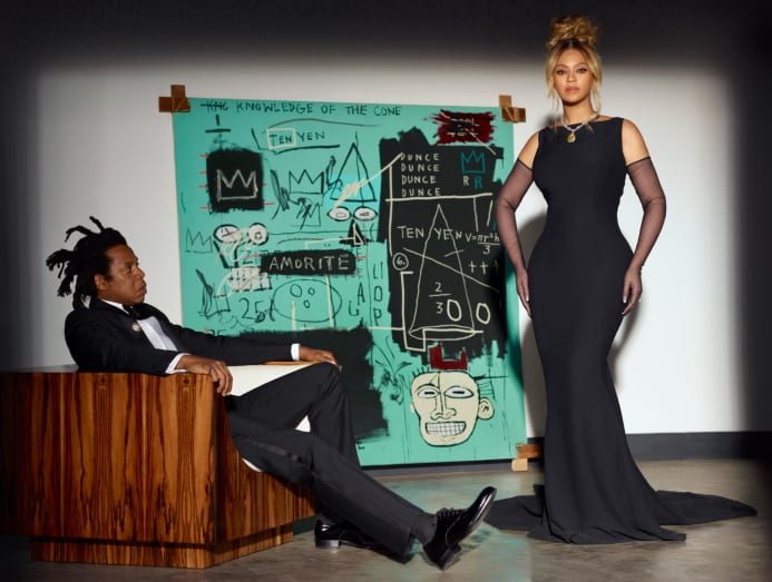 In campaign images, Beyonce and Jay-Z are pictured together against the backdrop of a never-before-seen Tiffany blue Jean-Michel Basquiat painting. This is the first time that the couple has appeared in a campaign together.
