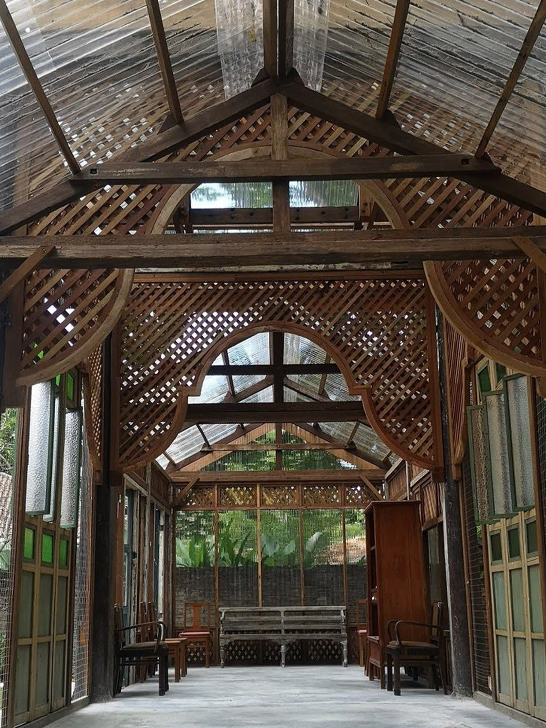 The house is a patchwork of Malaysian architectural history. French Marseille roof tiles from Raub, Pahang, and forestry squatters crown the structure. Massive timber columns and a 45-foot-long beam without joints were salvaged from a Kuantan sawmill. The main window frames, made in England, once graced a bungalow inside the Ipoh racecourse. Stained glass door panels were rescued from the chapel of Penang’s Little Sisters of the Poor. “These are just a few to mention,” Gooi said, his voice filled with pride. “There’s still lots more.”