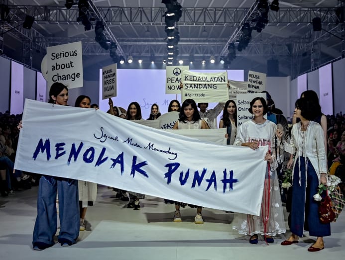 “We kept it a secret, even from the organiser!” Chitra Subyakto, the mastermind behind the show, gushed. “Statements as part of a fashion show had been done overseas, and we thought it would be an effective way to deliver the message. We invited the activists and celebrities to carry the banners, because we hoped the buzz will travel far, and be a part of the continuous effort to care for the Earth.”