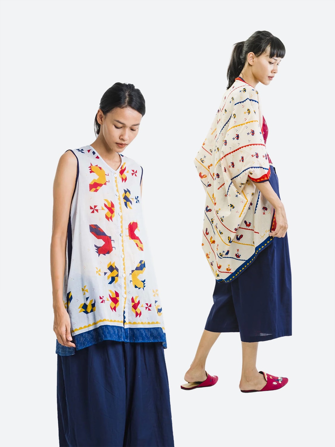 Subyakto is the founder and creative director of Sejauh Mata Memandang, a decade-old fashion brand known for its environmental values as much as its aesthetic. Sejauh’s first claim to fame was reinterpreting Indonesia’s classic chicken graphic that usually appears on bowls used by street food vendors into a contemporary icon. The chicken appears as a pattern on flowy, everyday clothing inspired by traditional costumes.