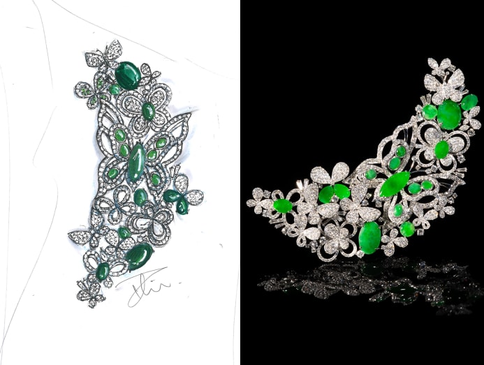 The most common bespoke requests are for the re-set of older pieces or the creation of new ones using inherited gemstones, said Chua. There has also been an increasing number of male customers looking for everyday accessories, including one who wanted to repurpose his grandmother’s jade into a meaningful keepsake. So, Ng created a statement brooch that incorporated the jade pieces with diamond butterfly motifs from their signature Butterfly Collection. Other royal commissions include a pair of diamond gloves for the Brunei princesses and a pair of diamond peridot earrings for Tuanku Sultanah Kalsom of Pahang, Malaysia.