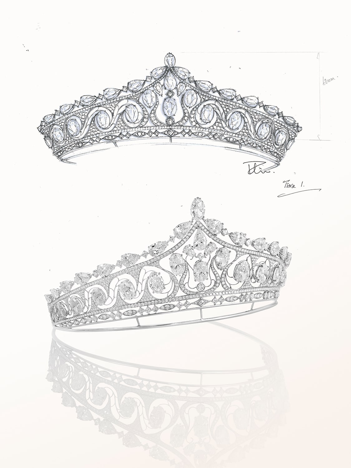 Ng shared: “We wanted the diamonds to look like they are floating so we designed very fine white gold lines to hold them. We also chose a plain glossy finishing for a cleaner look, instead of an antique finishing, which would have made the tiara more Art Deco in style.”