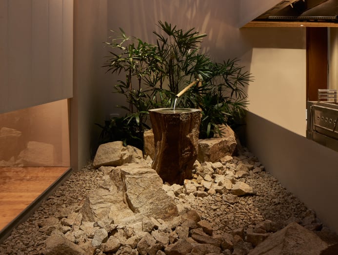 “When you enter any space, the first impression is crucial. Your mind can change with the approach. The first thing that guests encounter upon entering is a nakaniwa – a small internal courtyard garden accompanied by the gentle drip of water from the kakehi (bamboo fountain made of a waterspout) into a [hollowed] ancient fountain stone. The nakaniwa is the central focus of the design of Suzuki because my idea was to create a sushi bar within a garden,” Kuma expounded.