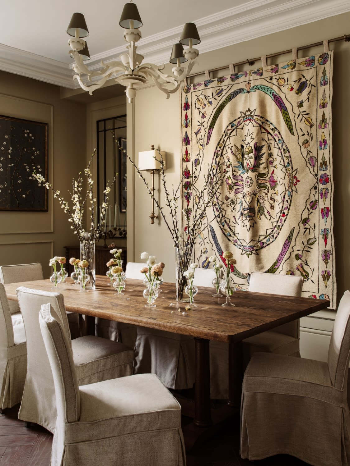 In keeping with the stature of The OWO, we ensured the apartment mirrored the grand proportions of the building whilst curating a striking blend of past and present that would lend a collected feel to the space. We incorporated beautiful bespoke pieces by English craftspeople, such as the Alfred Newall dining table and cabinets in the dining area made from stunning English oak, and the hand marbled paper lampshades on the chandelier in the master bedroom, all referencing traditional English craft.