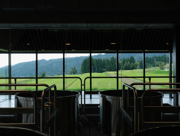 Kuma designed the Shiraiwa kura or brewery. Its construction was completed last October. The brewery’s appearance is reminiscent of a traditional Japanese farmhouse, with a thatched roof that is made of metal instead of grass for safety and practical reasons.