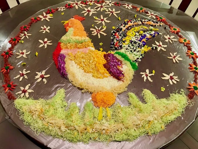 Everyone in the family chips in to help that day. My husband, Adrian, usually helps me to get fresh fruits and vegetables and other condiments. My eldest daughter helps with the lovely dessert spread together with her husband, Alvin, and my other children, Bertrand and Desiree. A gigantic yusheng can take me around four hours to design and create so it is really like food art. I absolutely enjoy preparing the yusheng and sharing it with family and friends.