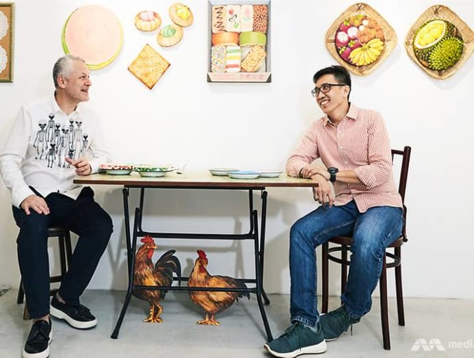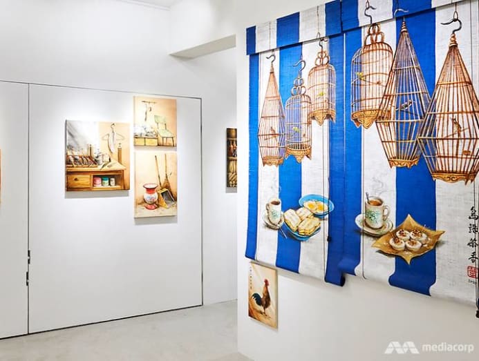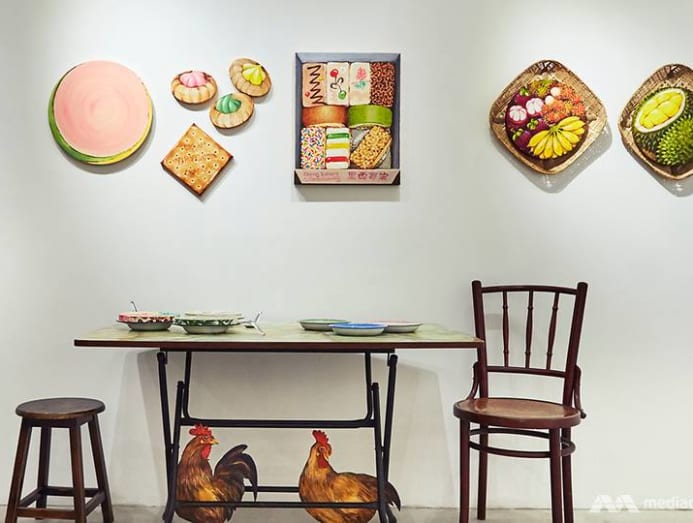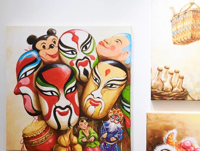 The ongoing exhibition, which opened on Jan 12 and runs till Mar 14, features vignettes inspired by his street art such as a sleeping cat painted directly onto a vintage wooden chair, a “flatlay” of a Chinese reunion dinner on a laminated table top as well as canvas paintings of traditional masks and lanterns.
