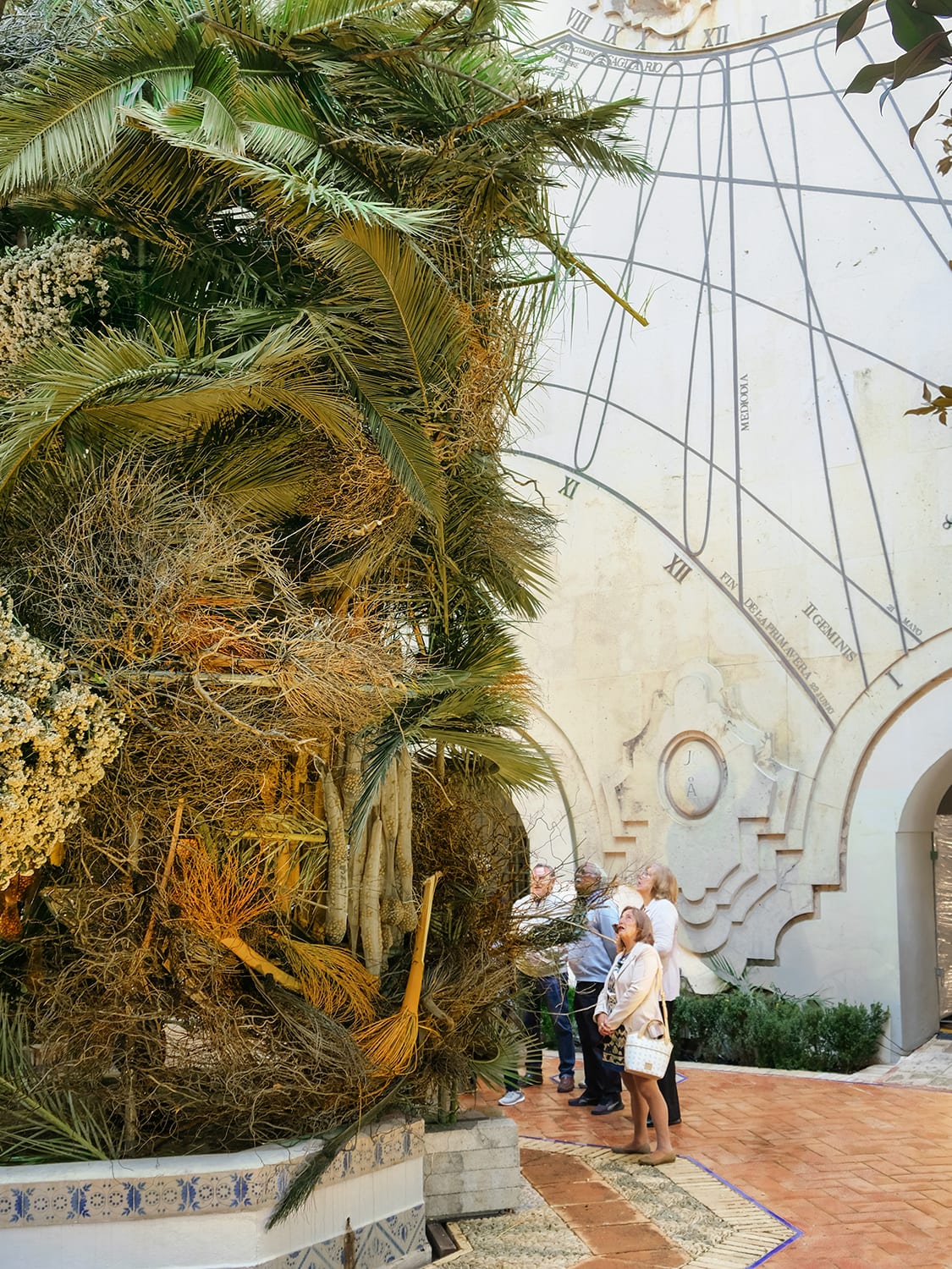 The installation towers above an archaic fountain and a sundial. Both – the give of water and keeper of time – “stand watch together, evoking the cycles of life and death.” The botanical installation put together by This Humid House presents a “speculative ecosystem” referencing diverse habitats, such as date palm piles that shelter beetles (reference: the beetles were the ancient pollinators of magnolias) and nest-like structures inspired by the homes of Andalusian white storks that tend to build their homes on top of manmade structures.