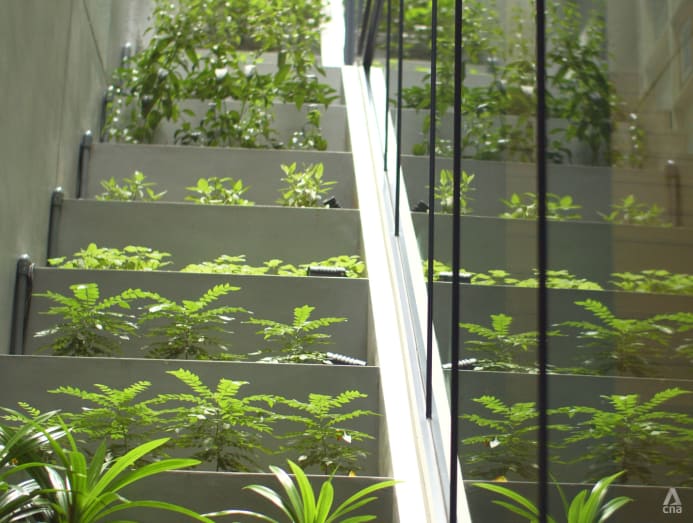 “The water and this layer of buffer insulates the house, it keeps it cool, and it protects it from the ravages of the weather as well,” explained Tan. Spice and vegetable terraces run along the length of the stairs, bringing the garden into the home.