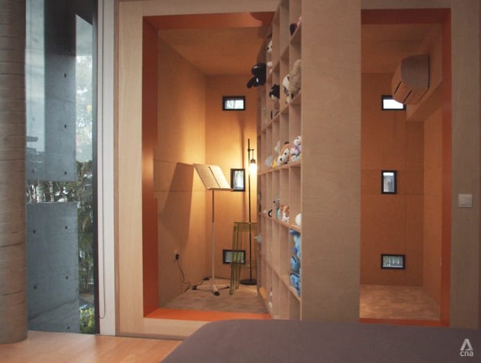 A shelf of stuffed toys swivels to reveal a secret studio where Lara practises her violin or viola. A sliding panel in the bedroom reveals a working space or bathroom. Sometimes, the family can’t find their pets, especially the cat, for a few days, as the animals have found a new place to hide among the three-storey-high cubby hole shelves.