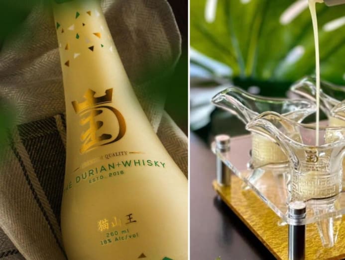 Despite its name, this Musang King Mao Shan Wang Durian + Whisky beverage is a “cocktail” blend of durian and whisky, and not whisky that is distilled from fermented durian flesh.