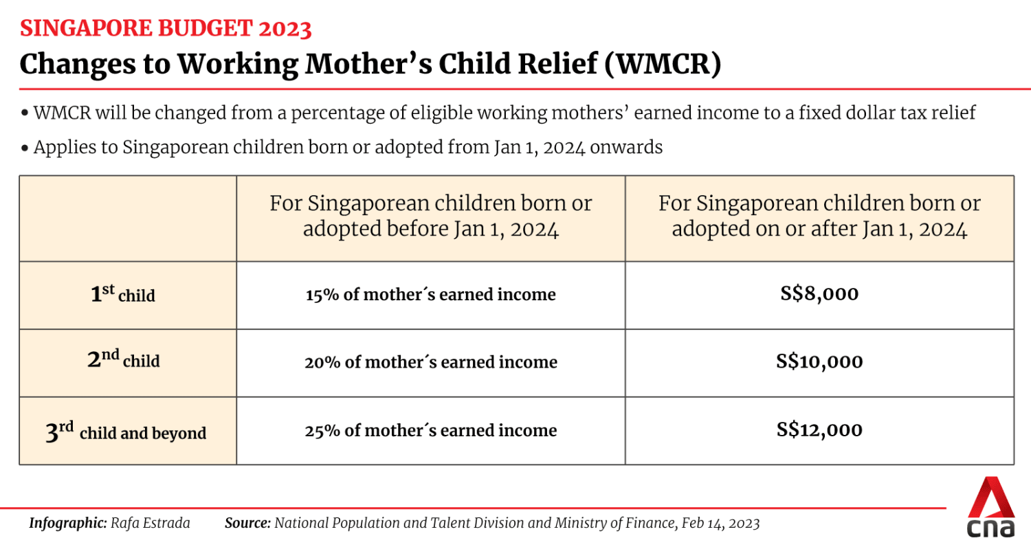 The Working Mother’s Child Relief will be changed to a fixed dollar relief - instead of a percentage of the mother’s earned income - for Singaporean children born or adopted from Jan 1 next year, Mr Wong said.