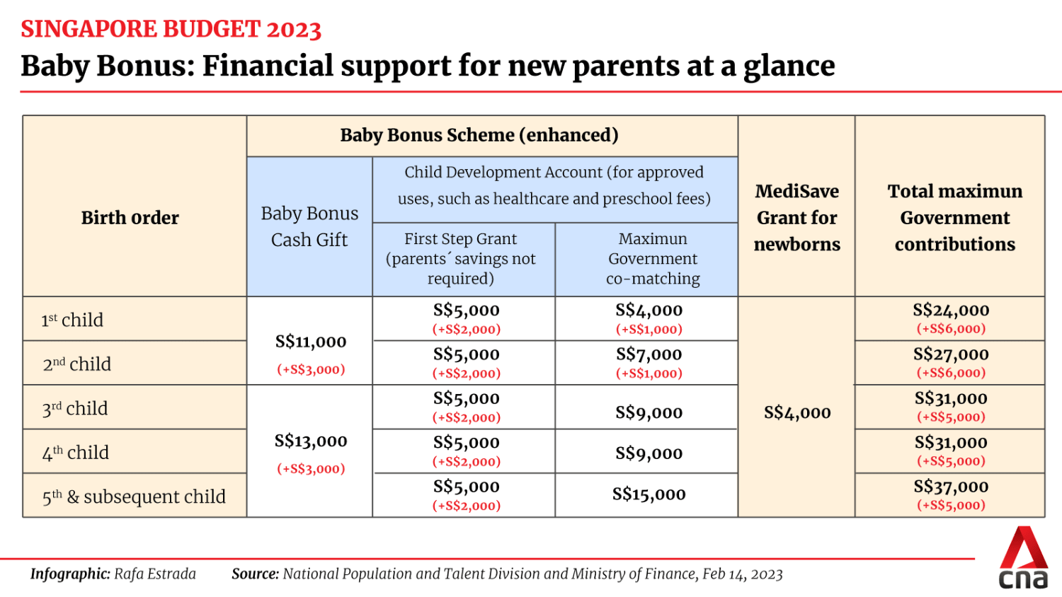 First - the CDA First Step Grant for all eligible Singaporean children born from Feb 14 will be increased from S$3,000 to S$5,000.