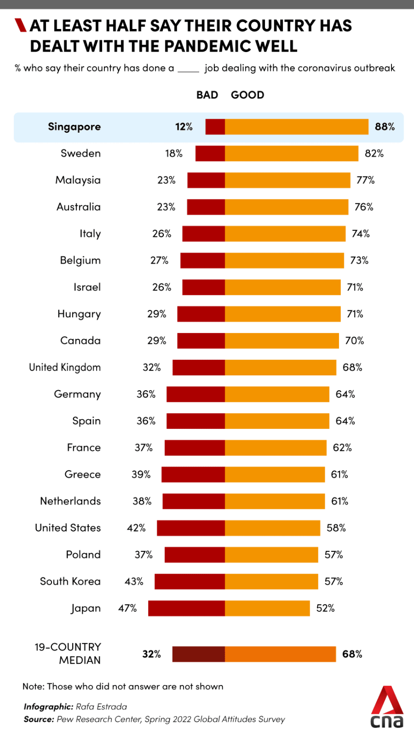 In a study released on Thursday (Aug 11) by American research think-tank Pew, nearly nine out of 10 Singaporean respondents also said their country has dealt with the pandemic well.