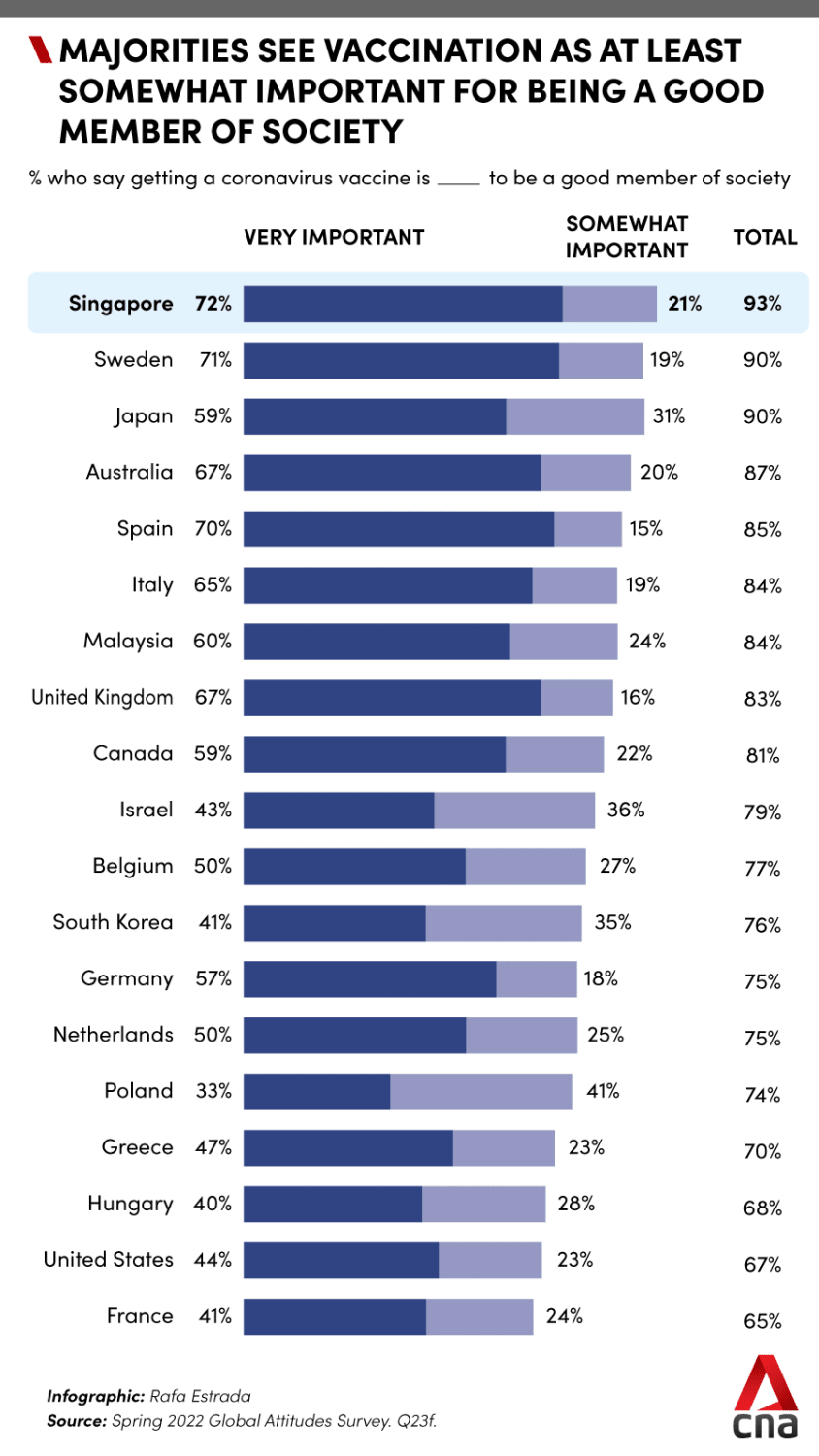 Among 24,525 people in 19 advanced economies that were polled, Singaporeans also stood out for having more than seven in 10 respondents see vaccination as very important for being a good member of society.